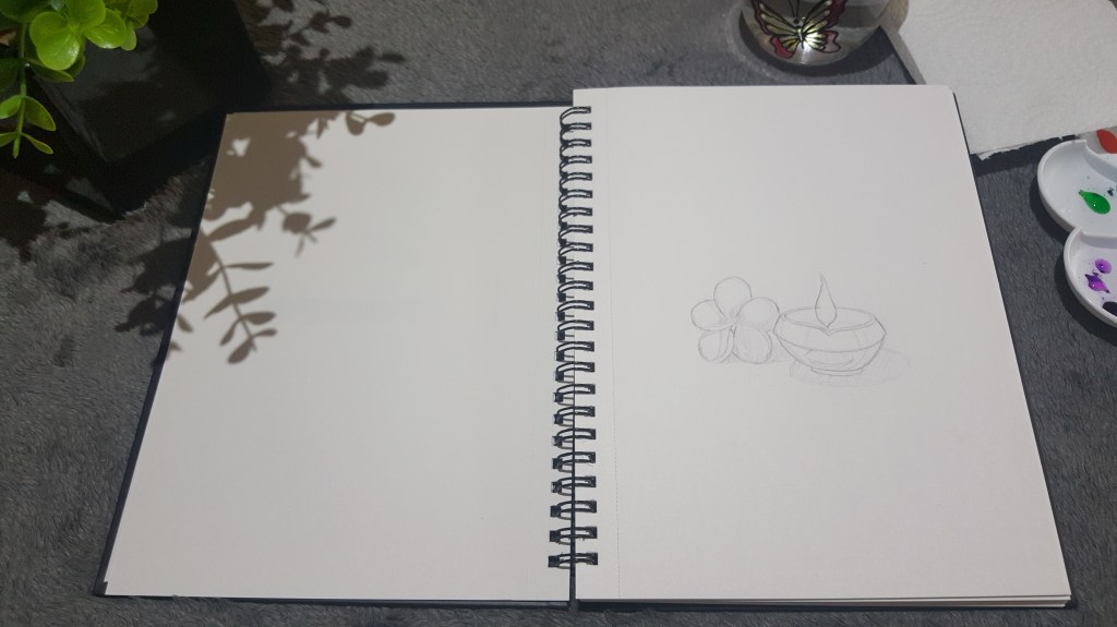 Then now let’s go on to our next object in the picture that is a flower, this flower is kept at a ground level behind the diya so remember the perspective of objects as it will determine your final look of the painting and also the dark tones you will need to give for making it look realistic .