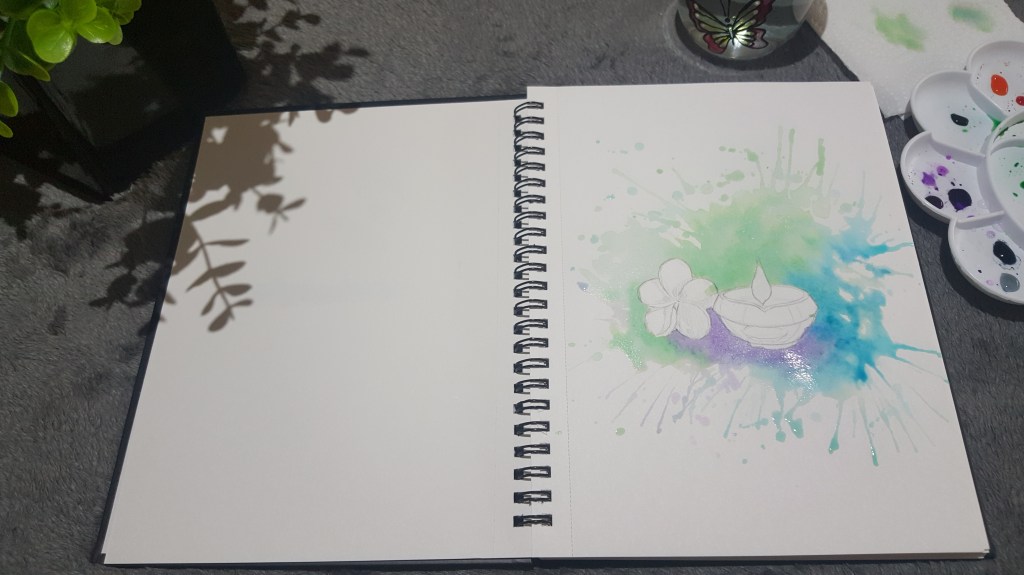 Now let’s begin the first wash on the objects Diya and the flower. For which I have used Yellow ochre color, lightly color the diya with the yellow ochre color leaving the places of highlights to give it a realistic look through showcasing reflection.You can always mark the places of highlights with pencil when sketching as I have done.This was the first coat of Diya now going ahead to color the flower , I have kept the flower white but to enhance it a little bit and show its dark tones I have mixed little bit of cobalt blue+red +yellow to achieve a darker shade to add depth to the flower near the curves. The center of the flower as well as the petals are highlighted using yellow occur color to show the light reflection obtained due to the light of diya.