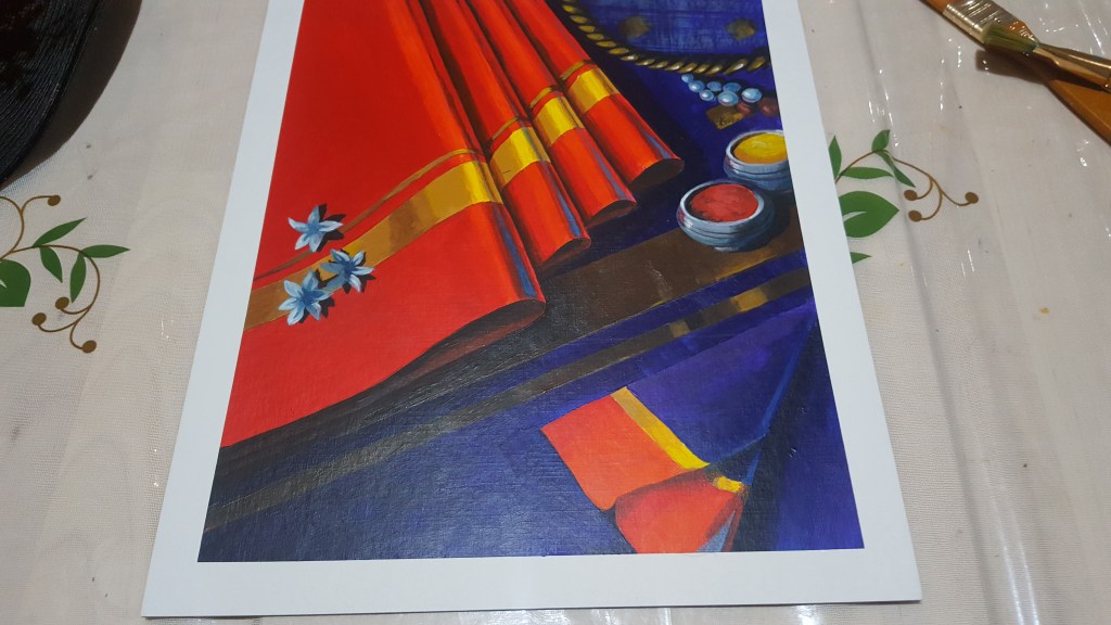 In order to add the shadow of the red sari on the blue background I have used blue and hint of black mixed together and used it to give a darker tone. Similarly, the folds of red sari were also given the darker tone by using red and hint of black in it.Also ahint of blue is added to the edges of the sari to give a feel of reflection of the underlying blue sari,this also helps giving a realistic feel of the overall composition of the painting.