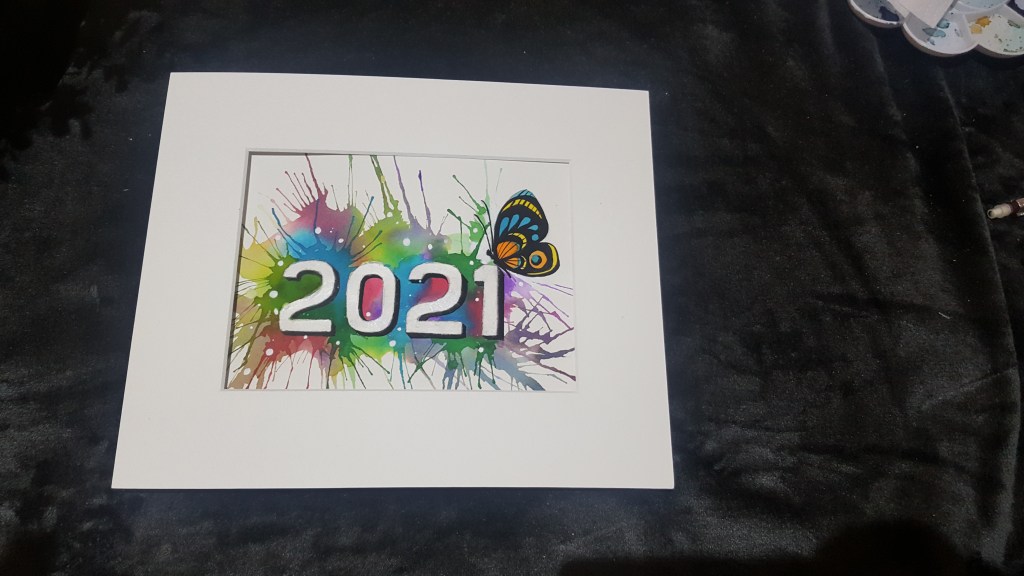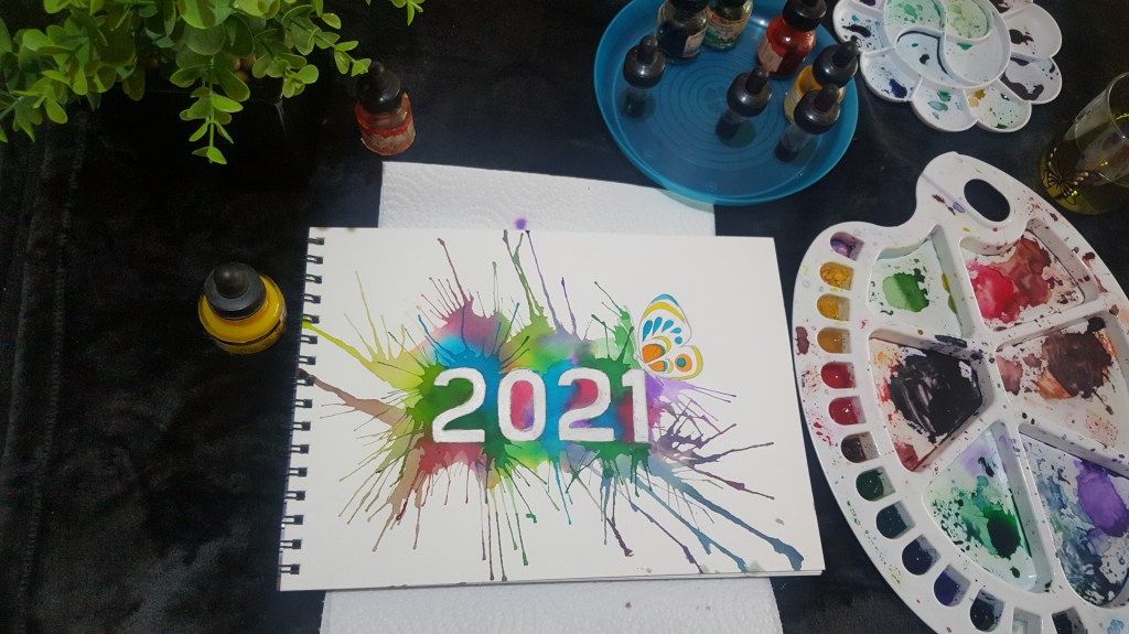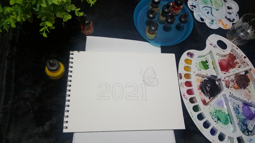 Once dries now you can move on to the little butterfly and color it as you wish .After which you can slowly give an outline to 2021 with a sketch pen and then jus drop few drops of white acrylic paint in form of dots here and there.